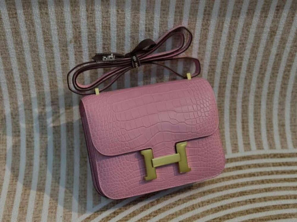 حقيبة هيرمز جلد تمساح باللون الزهري